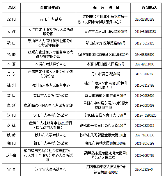 2.资格审核(核验和核查)工作按属地化原则进行。其中,各市报考人员资格审核(核验和核查)工作由所在市人事考试部门负责。驻沈中、省直单位报考人员资格审核(核验和核查)工作由省人事考试中心负责。资格审核部门可依据考试报名属地化管理的具体要求,利用当地政府共享数据对报考人员户籍、社保等信息进行复核。(资格审核单位详细信息见附件)。