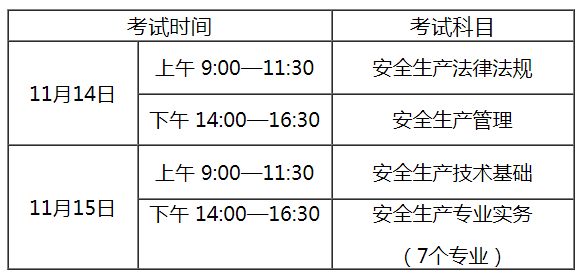中级注册安全工程师职业资格考试设《安全生产法律法规》(客观题)、《安全生产管理》(客观题)、《安全生产技术基础》(客观题)、《安全生产专业实务》(主客观题)4个科目。其中《安全生产法律法规》《安全生产管理》《安全生产技术基础》为公共科目,《安全生产专业实务》为专业科目。《安全生产专业实务》科目分煤矿安全、金属非金属矿山安全、化工安全、金属冶炼安全、建筑施工安全、道路运输安全和其他安全7个专业类别。具体考试时间及科目如下: