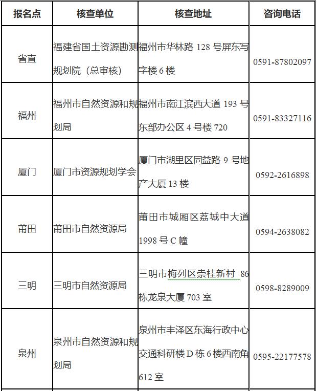 备注:1.请不同区域考生向相应报名点咨询或电话联系,福建省国土资源勘测规划院不接受省直以外考生的咨询电话。2.咨询时间为工作时间。