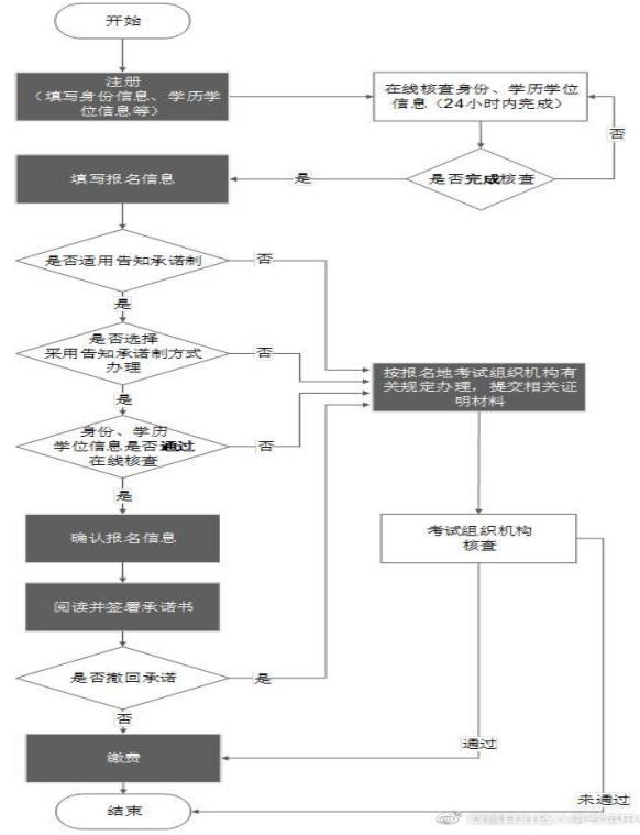 注册时,身份信息和学历(学位)信息在线核查结果为“核查通过”且选择并适用告知承诺制办理的报考人员,无需进行现场人工核查,系统将自动核查其报名资格,通过后直接缴费完成网上报名工作,届时打印准考证参加考试即可。