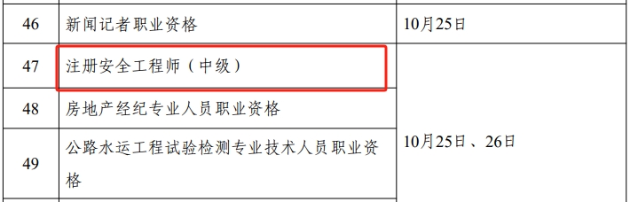 2025年注册安全工程师(中级)考试时间:10月25日、26日